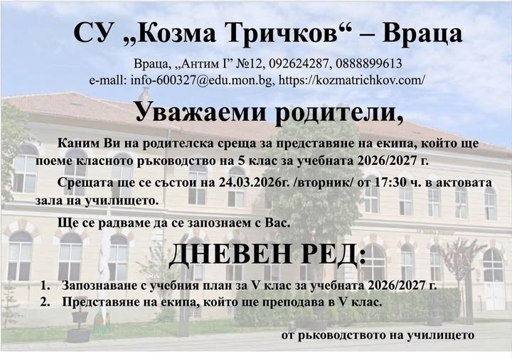 Патронен празник на Средно училище „Козма Тричков“ – 130 години традиция и вдъхновение! На 27 февруари 2026 г. отбелязахме 130 години от първия училищен звънец в настоящата сграда на нашето училище – 130 години история, знание, традиции и мечти.