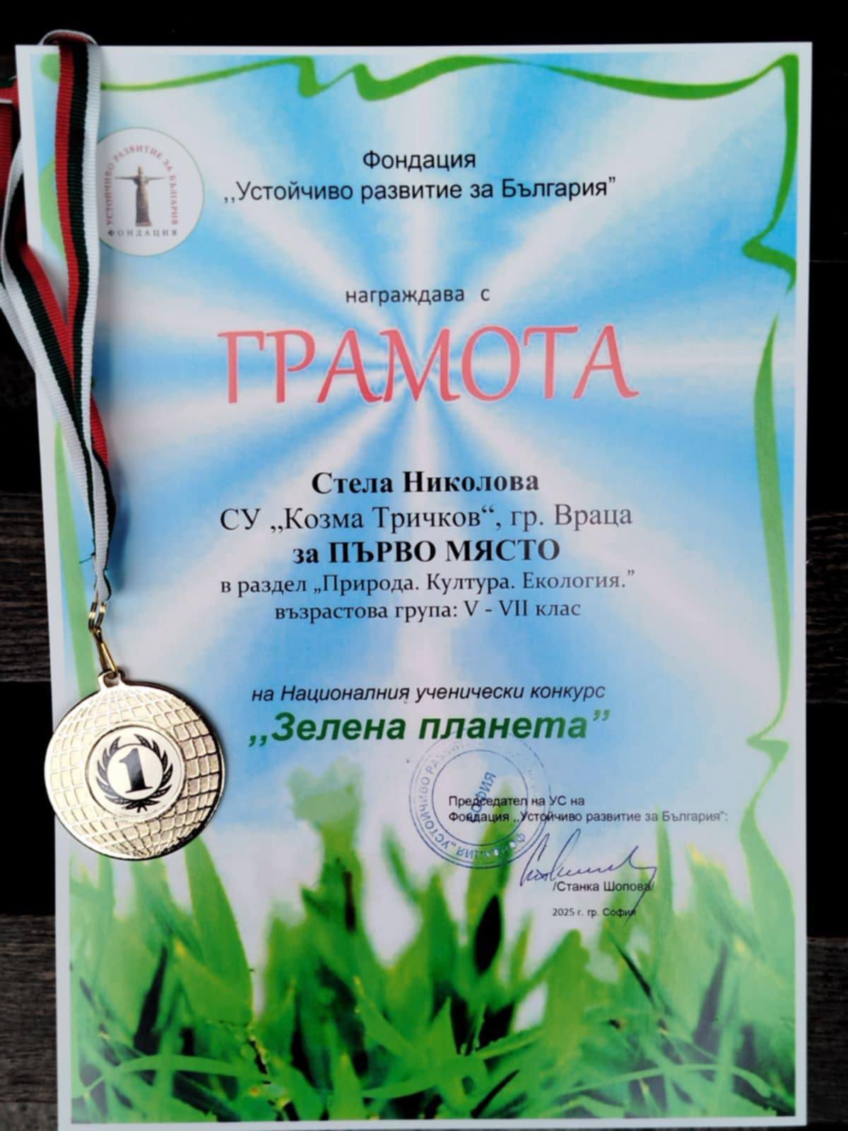Стела Николова (7.б) – I място в НК „Зелена планета“, категория „Природа. Култура. Екология.“